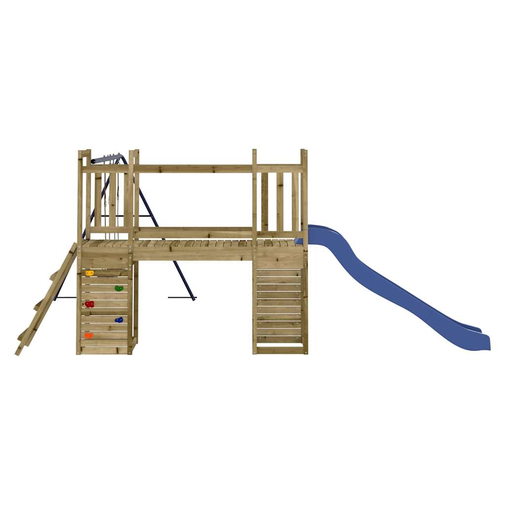 Der stabile Holzrahmen sorgt für Sicherheit und Robustheit, während das „A“-förmige Gestell die Stabilität der Kinderschaukel gewährleistet. Mit einer Plattformhöhe von 90 cm, einer Wellenrutsche, zwei Schaukeln, einer Felswand und Sandkästen bietet der Spielturm ein umfassendes Spielzentrum, das Kinder dazu einlädt, ihre Freunde zum Mitspielen einzuladen. Die umlaufenden Holzgeländer sorgen für zusätzliche Sicherheit beim Spielen.