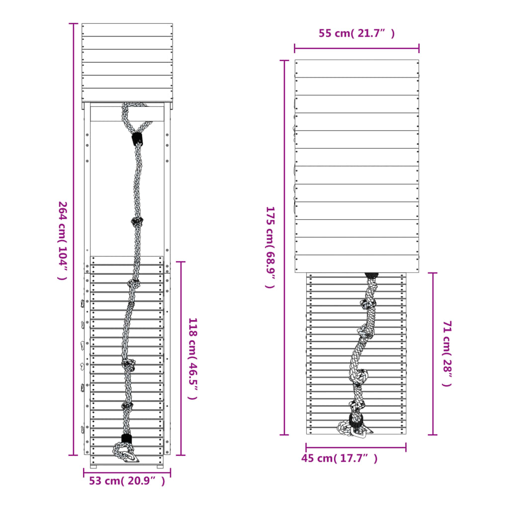 Abmessungen der Kletterwand: 45 x 5 x 147 cm (L x B x H)
